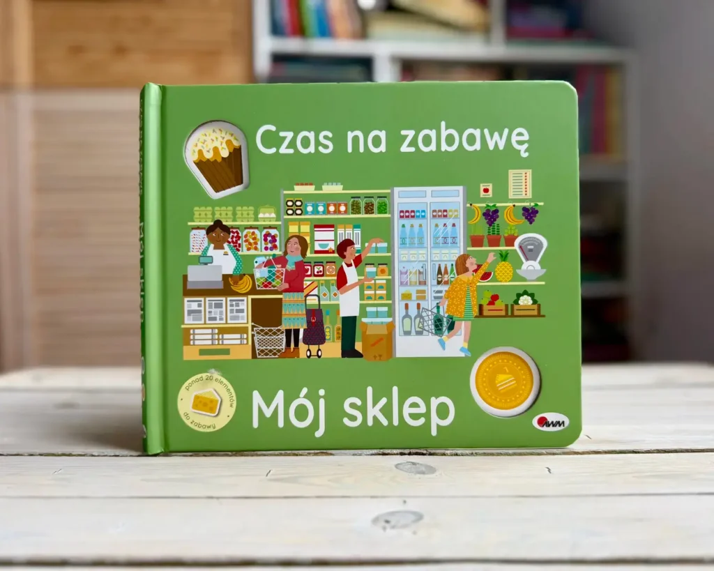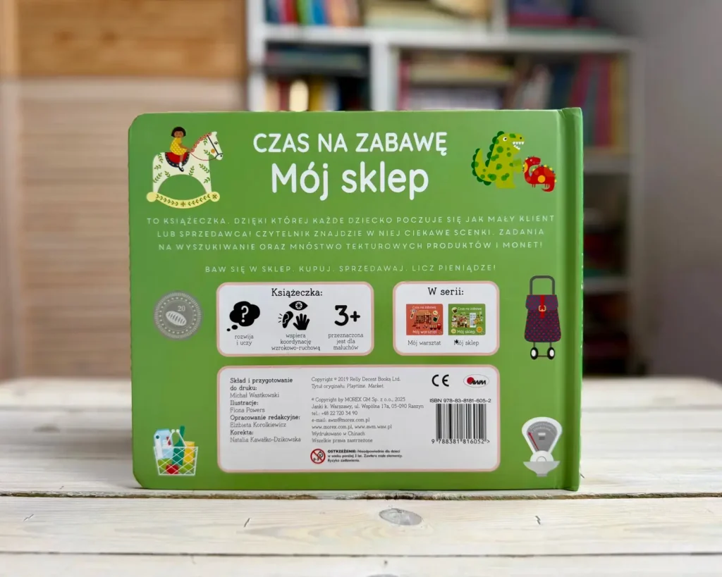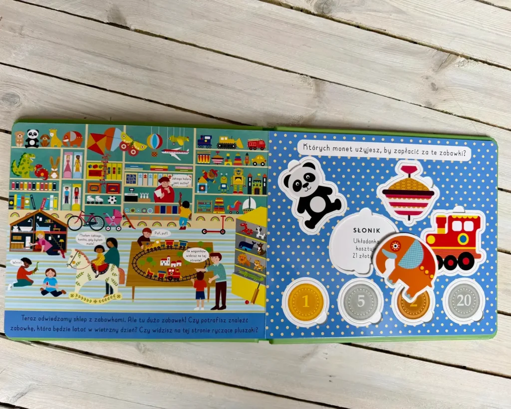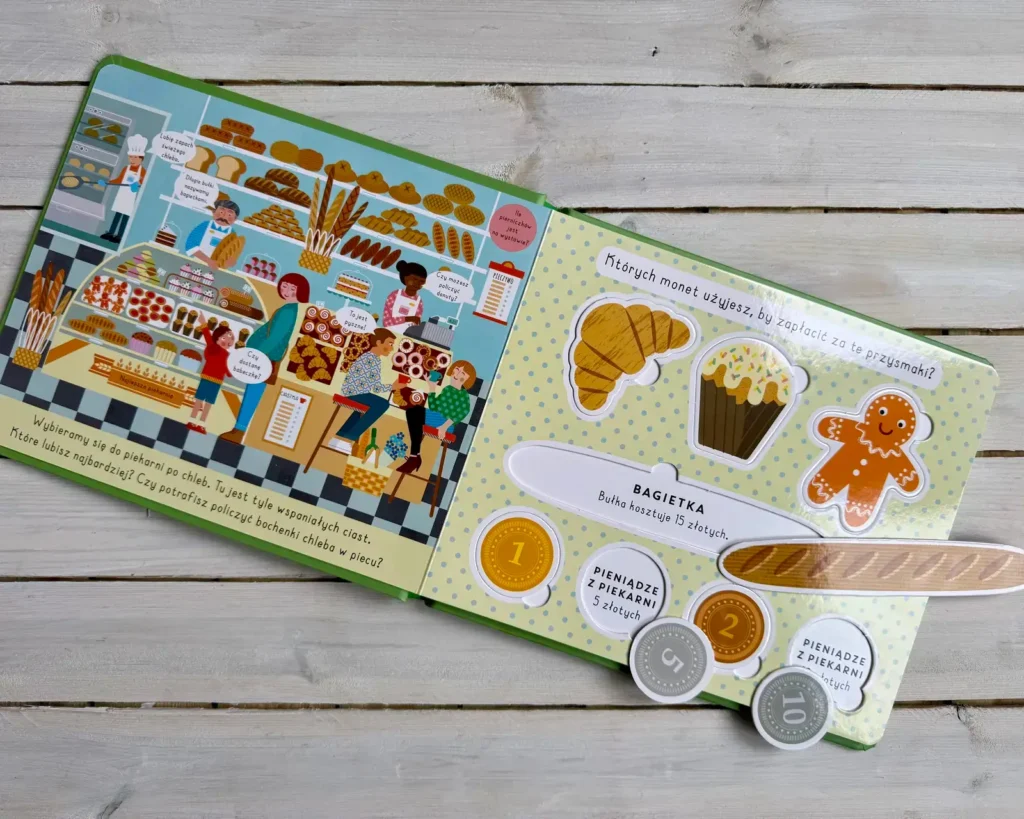 W tej „sklepowej” zabawie pojawiają się tekturowe produkty i monety, krótkie teksty oraz pytania zachęcające do rozmowy. Dziecko może kupować, sprzedawać, liczyć pieniądze i odgrywać scenki.