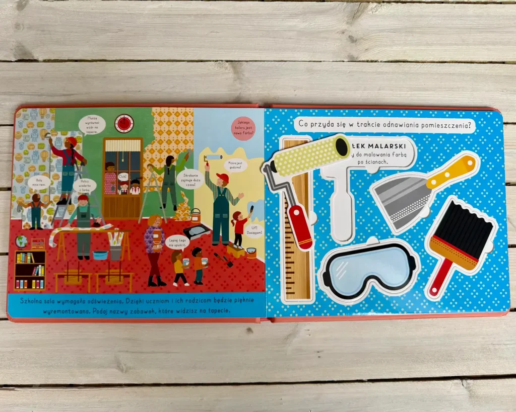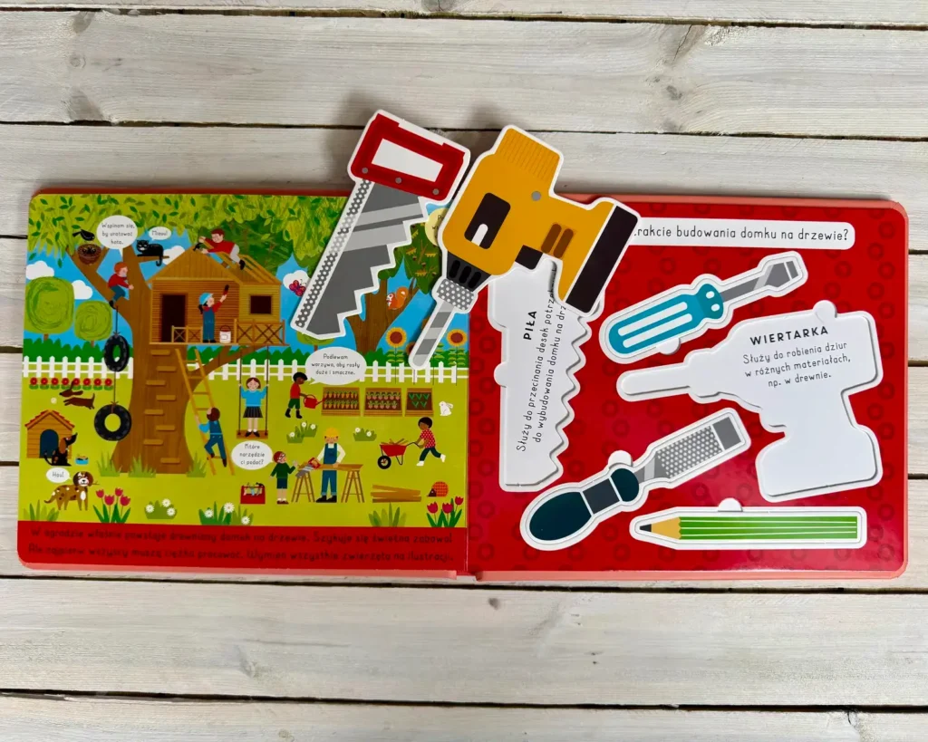 Z kolei wersja warsztatowa to prawdziwe królestwo narzędzi. W środku czekają młotek, piła czy wałek malarski, zadania na wyszukiwanie i pomysły na własne historyjki.