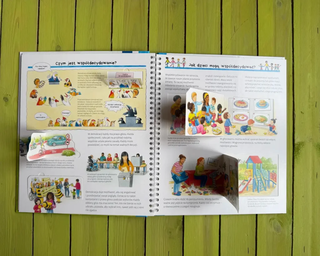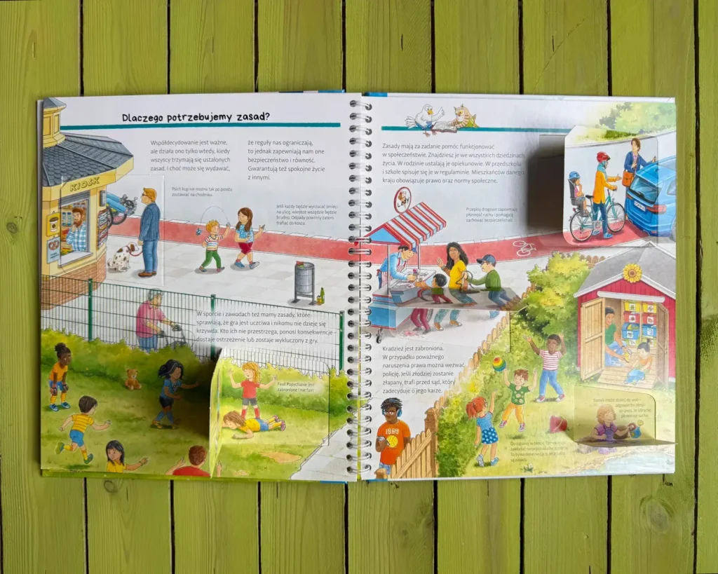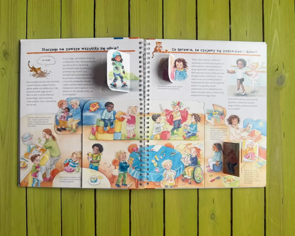 To książki idealne dla przedszkolaków, ale spokojnie sprawdzą się też w pierwszej i drugiej klasie. Mają mnóstwo okienek i to jest taka fajna forma dopełnienia, zarówno wizualna, jak i tekstowa. Dziecko zagląda, odkrywa, pyta. A ty masz gotowy punkt zaczepienia do rozmowy.
