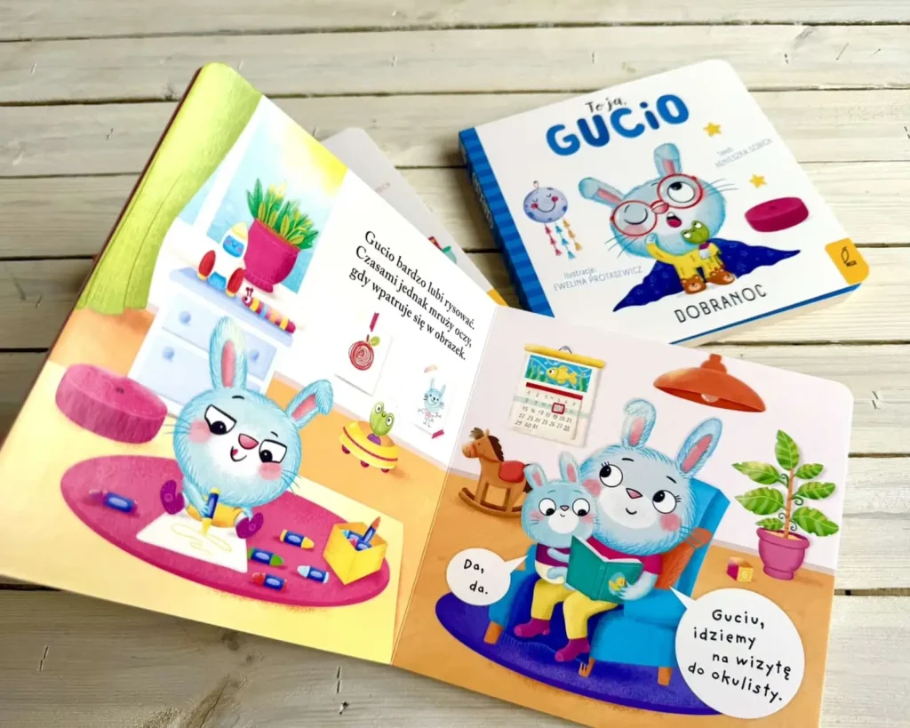 Gucio nie jest superbohaterem, nie rozwiązuje zagadek, nie fruwa. Gucio myje zęby, szykuje się do snu i… nosi okulary. Czyli robi dokładnie to, co robią (albo mają robić) nasze dzieciaki. I właśnie dlatego te książki mają dużą szansę stać się ulubioną serią najmłodszych, bo są po prostu o nich. Bez zbędnych ozdobników, ale z czułością.